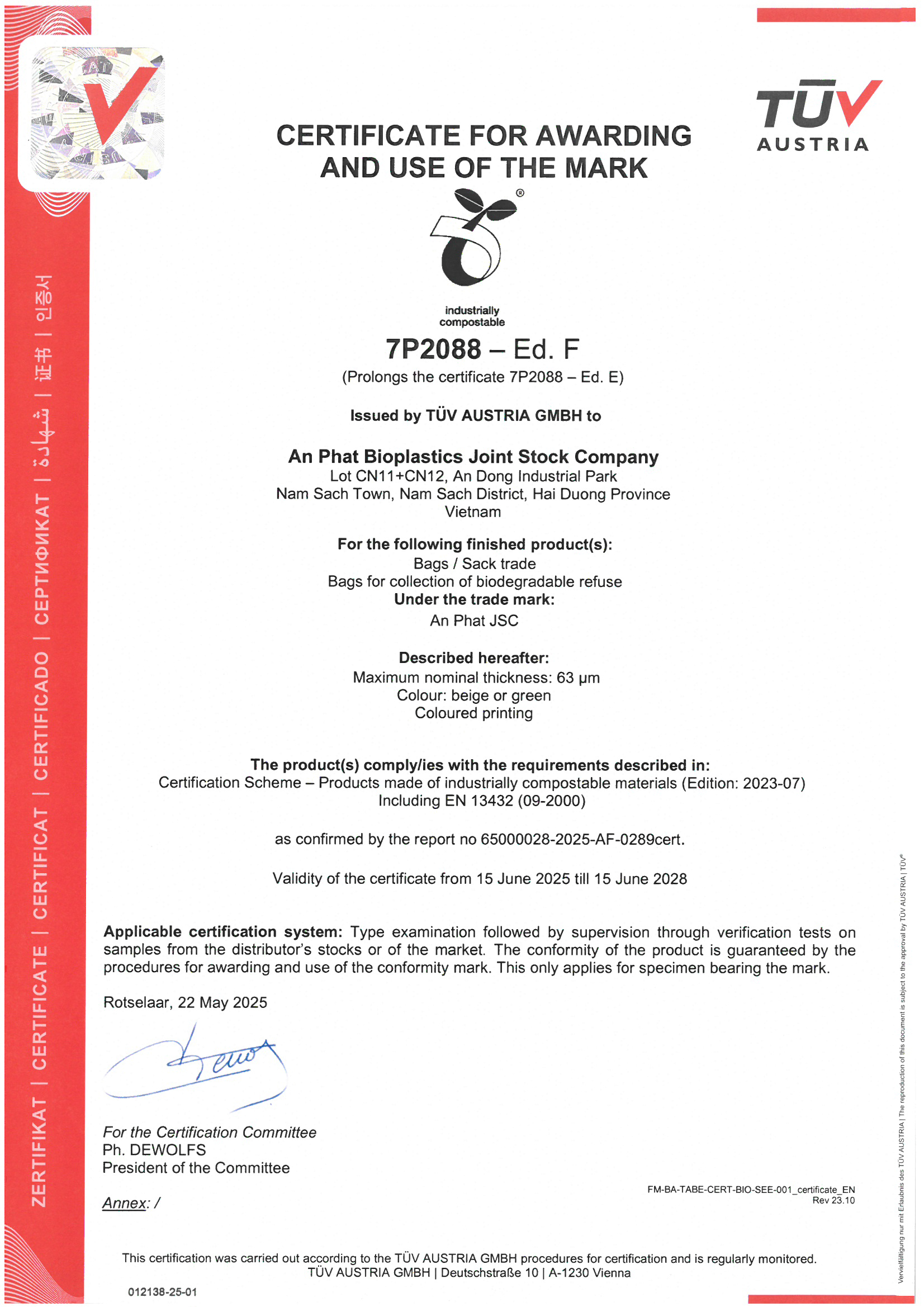 Jul 2018: Certificate by TÜV AUSTRIA for bag for collection of biodegradable refuse